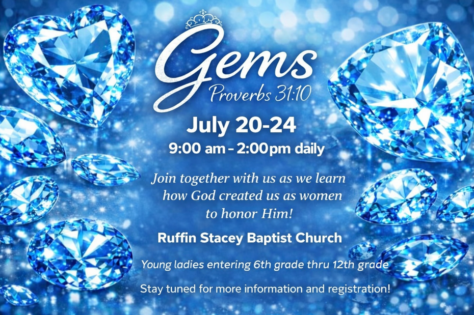 Each July we have Gems Young Ladies Day Camp. Young ladies entering 6th grade-12th grade come together to see what God has called us to as women of God, cooking, meal prep, crafting, service project and lots of laughs! Contact Mrs. Christie for information.